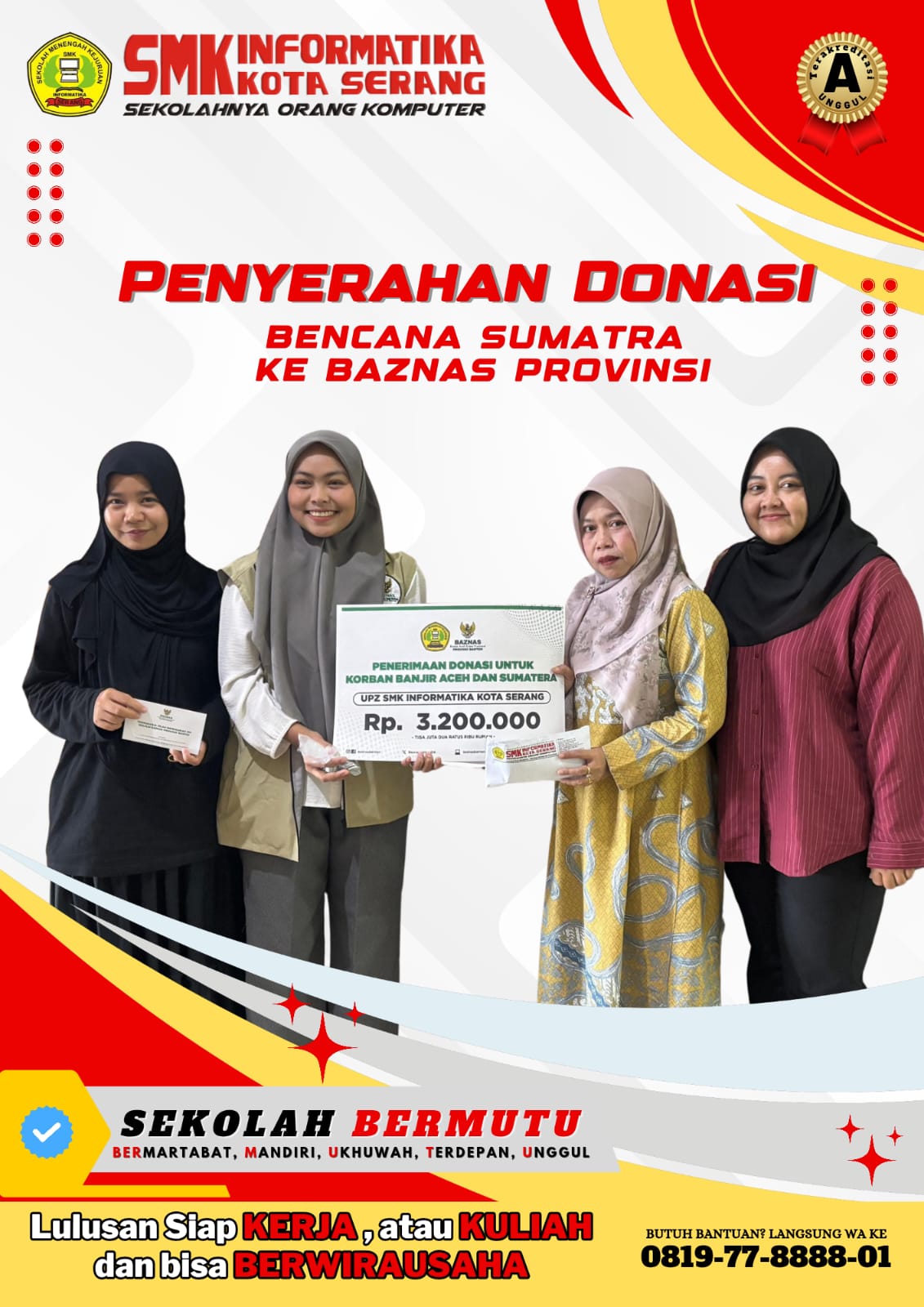 SMK Informatika Kota Serang telah melaksanakan kegiatan penyerahan donasi Peduli Sumatera kepada BAZNAS Provinsi Banten pada tanggal 12 Desember 2025. Kegiatan ini merupakan wujud kepedulian dan solidaritas keluarga besar SMK Informatika Kota Serang terhadap saudara-saudara kita di Sumatera yang membutuhkan bantuan.