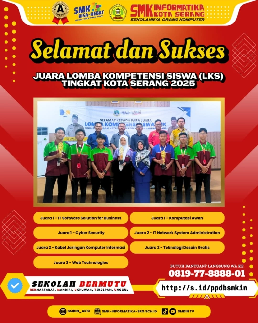 SMK Informatika Kota Serang kembali menorehkan prestasi membanggakan dengan berhasil meraih 7 piala sekaligus dalam ajang Lomba Kompetensi Siswa (LKS) Tingkat Kota Serang Tahun 2025. Prestasi ini merupakan hasil kerja keras para siswa, pembimbing, serta dukungan seluruh civitas akademika SMK Informatika Kota Serang.